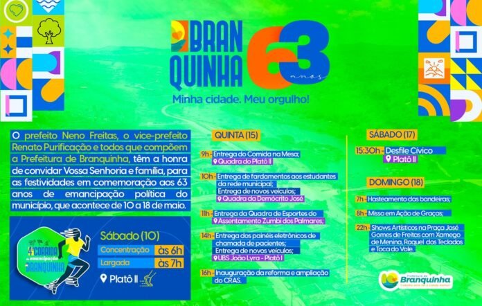 “Com eventos esportivos, inaugurações, desfile cívico e shows com as bandas Xamego de Menina, Raquel dos Teclados e Toca do Vale, queremos celebrar junto aos branquinhenses e visitantes, mais um ano da nossa cidade, nosso orgulho,” convidou o prefeito Neno Freitas.