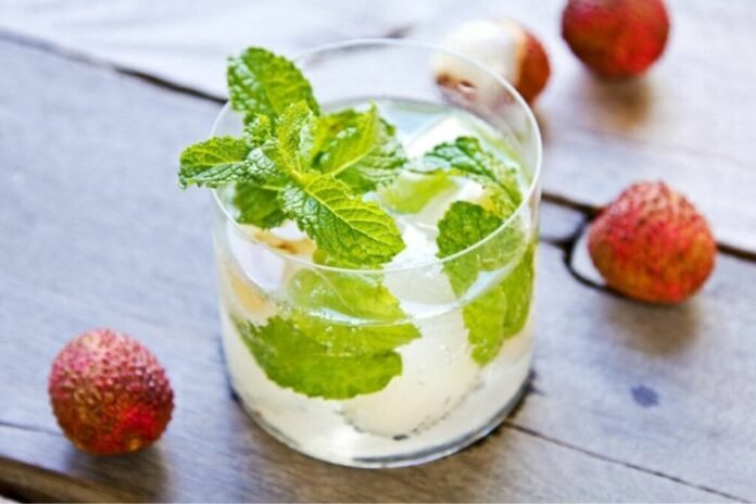 Em um liquidificador, coloque a água de coco, a polpa das lichias e as raspas de gengibre e bata até obter uma consistência homogênea. Transfira o suco para um copo e adicione as pedras de gelo. Finalize decorando com as folhas de hortelã e sirva em seguida.