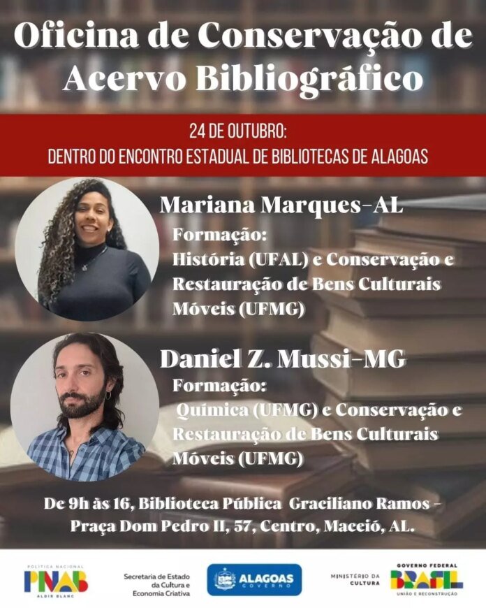 A oficina ocorrerá na Biblioteca Estadual Graciliano Ramos no horário das 9h às 16h e será ministrada por Mariana Marques, historiadora e conservadora-restauradora, e Daniel Z. Mussi, químico e conservador-restaurador. As inscrições estão abertas e podem ser realizadas por este link.