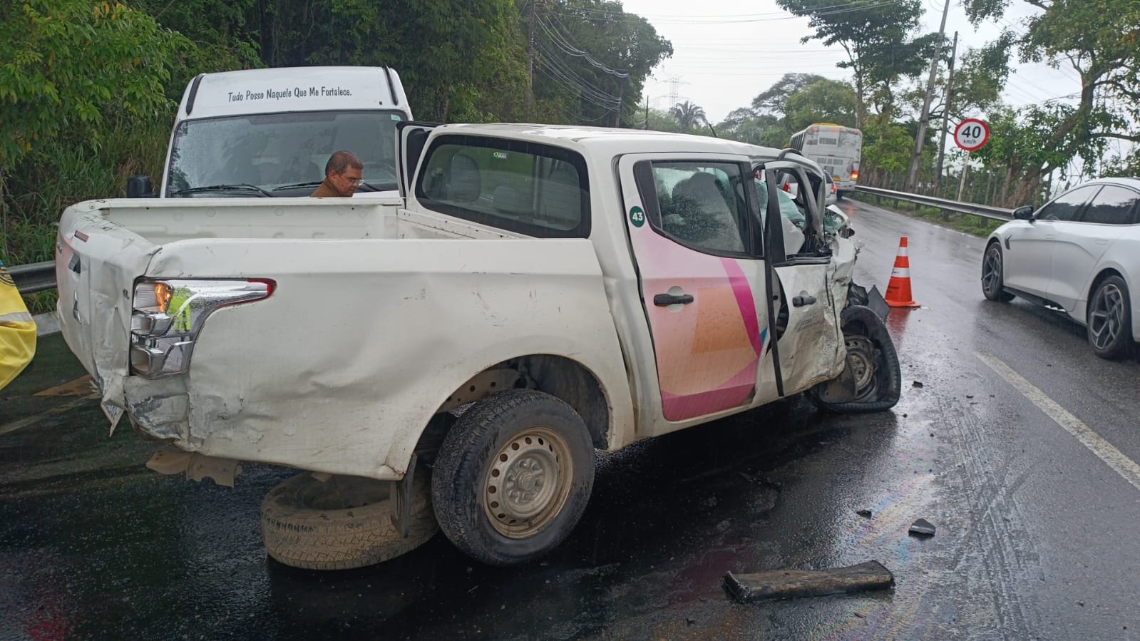 O acidente envolveu uma caminhonete, um ônibus e uma van, que ficaram parcialmente destruídos pelo impacto da colisão; assista ao vídeo: