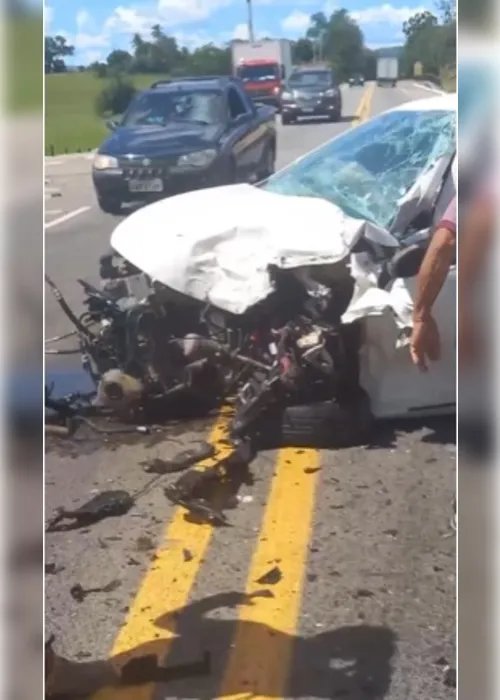 Imagem registrada por uma testemunha mostra um dos veículos capotado no meio da rodovia e outro automóvel de cor branca, com a parte frontal completamente destruída.