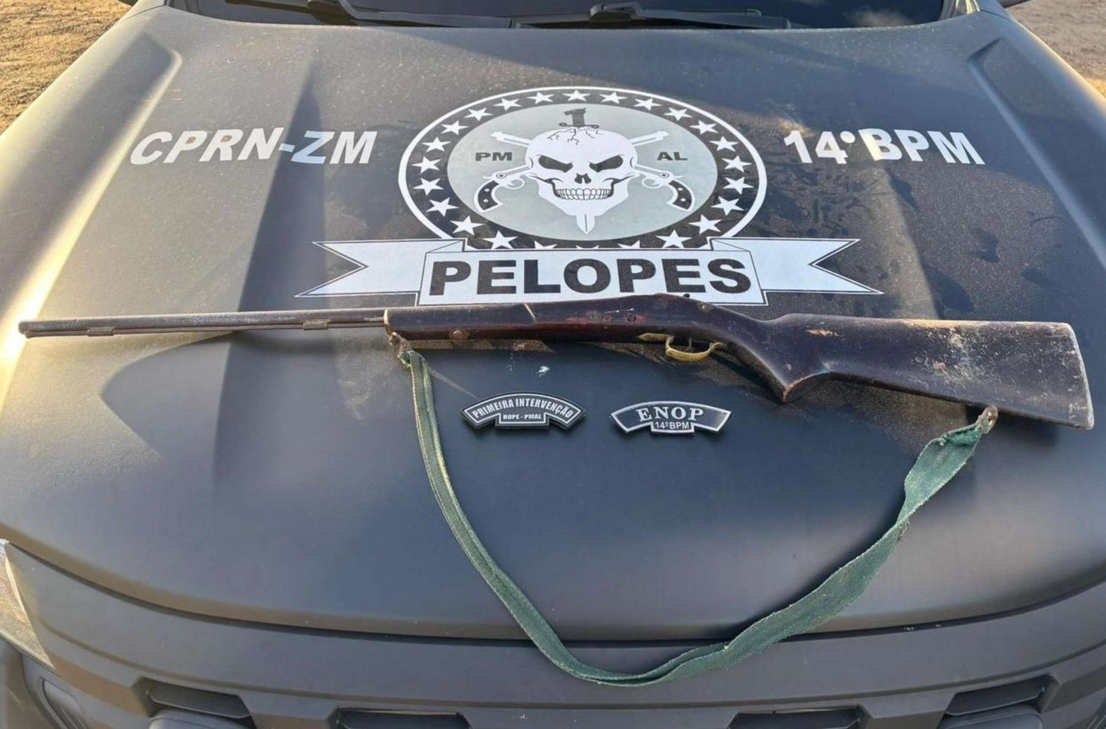 Espingarda de calibre não identificado e sem numeração visível foi apreendida pelos militares