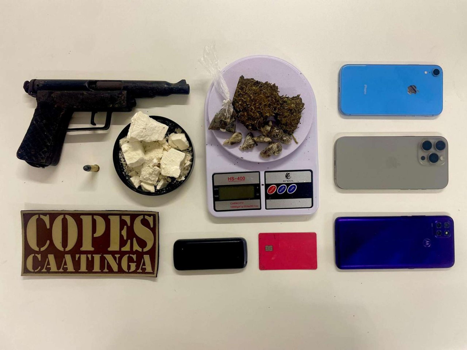 Uma dupla foi presa na tarde de quinta-feira (8), por volta das 15h, no município de Olho D’Água das Flores. Dois homens, de 22 e 27 anos, foram flagrados com uma arma artesanal, 51 gramas de maconha, 146 gramas de substância análoga à cocaína e dois smartphones. A prisão foi efetuada por militares da Companhia de Operações Policiais Especiais do Sertão (Copes).