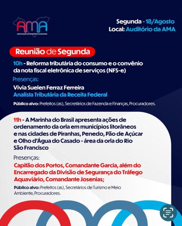 Para evitar a suspensão das transferências voluntárias da União, prevista no § 7º do art. 62 da Lei Complementar nº 214, de 2024 e riscos, a equipe técnica da Receita Federal de Alagoas participa da reunião desta segunda-feira ( dia 18), para apresentar as ferramentas operacionais da implantação da NFS necessárias para o cumprimento da legislação e os impactos positivos da padronização nacional no sistema tributário municipal.