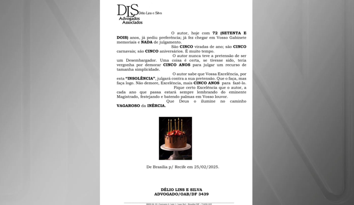 Um advogado de Brasília incluiu um “parabéns” inusitado em uma petição encaminhada para o Tribunal de Justiça de Pernambuco (TJPE). Délio Lins e Silva enviou uma foto de um bolo de aniversário, parabenizando o desembargador Alberto Nogueira Virgínio pelos cinco anos de análise do caso que está defendendo.