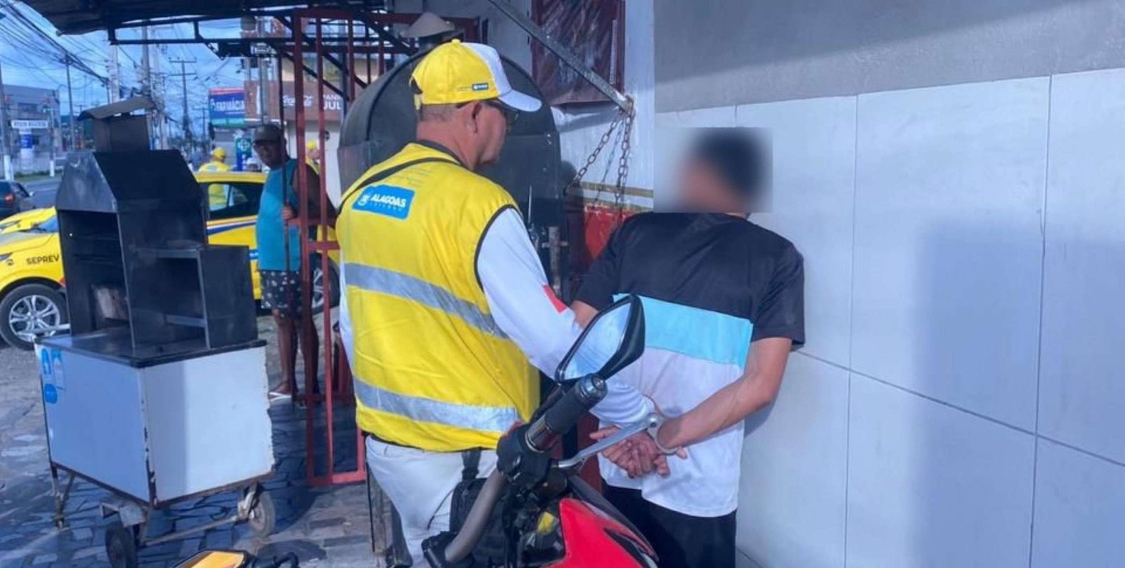 A guarnição realizava patrulhamento de rotina quando foi abordada por um casal que conduzia o suspeito. Eles relataram ser proprietários de um estabelecimento comercial e informaram que o homem havia consumido bebidas e alimentos, gerando uma despesa no valor de R$ 130,00. No momento de efetuar o pagamento, o indivíduo alegou não possuir dinheiro e, após uma discussão, fugiu do local.