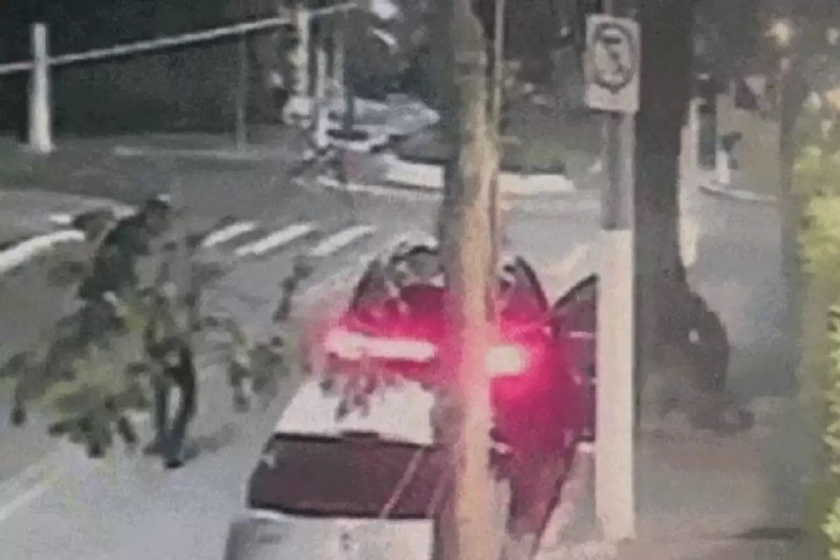 Imagem de câmera de monitoramento flagrou o momento em que o criminoso chegou em uma moto e parou ao lado da porta do motorista com uma arma na mão. Um homem armado saiu pela porta traseira do lado da calçada, e outro do banco do carona, e atiraram no suspeito.