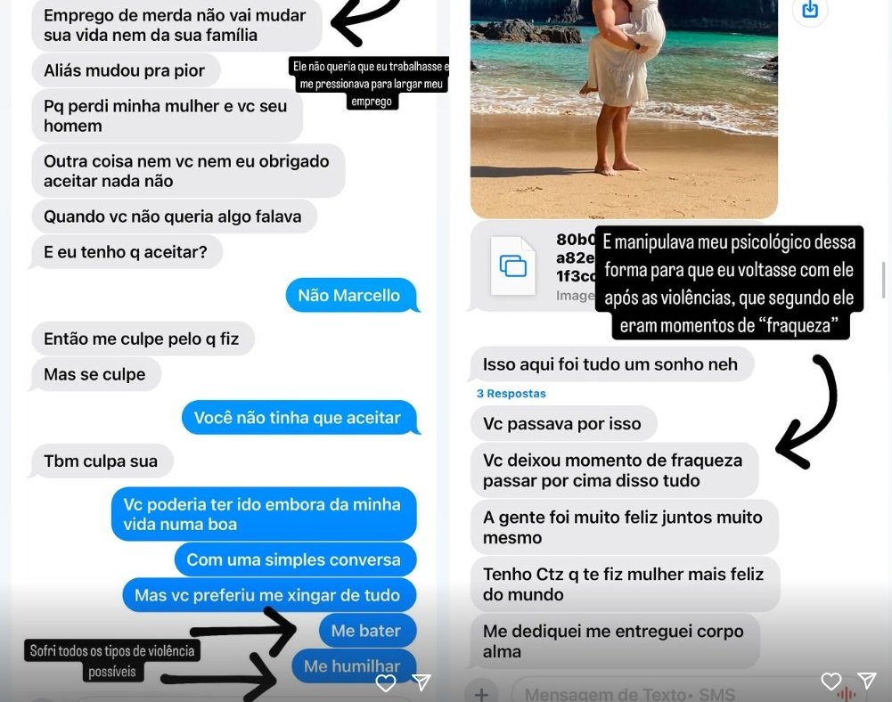 “Essa conversa é de setembro de 2024, onde eu estava trabalhando em uma campanha política como storymaker do candidato. Eu terminei o relacionamento porque ele me agrediu. Depois do nosso término, eu tinha bloqueado ele no WhatsApp e o mesmo me mandava SMS. Eu não podia pegar carona com homens, nem trabalhar no meio político, era xingada, ameaçada, chantageada e violentada. Eu nunca dei um motivo sequer para que o mesmo se sentisse traído, sempre respeitei como pessoa, namorado, homem, em todas as esferas. Diante de tantas mentiras, se não bastasse toda exposição e humilhação que estou vivendo, tenho que vir mostrar a verdade!”, postou na legenda da publicação.