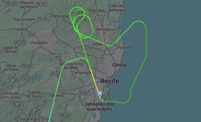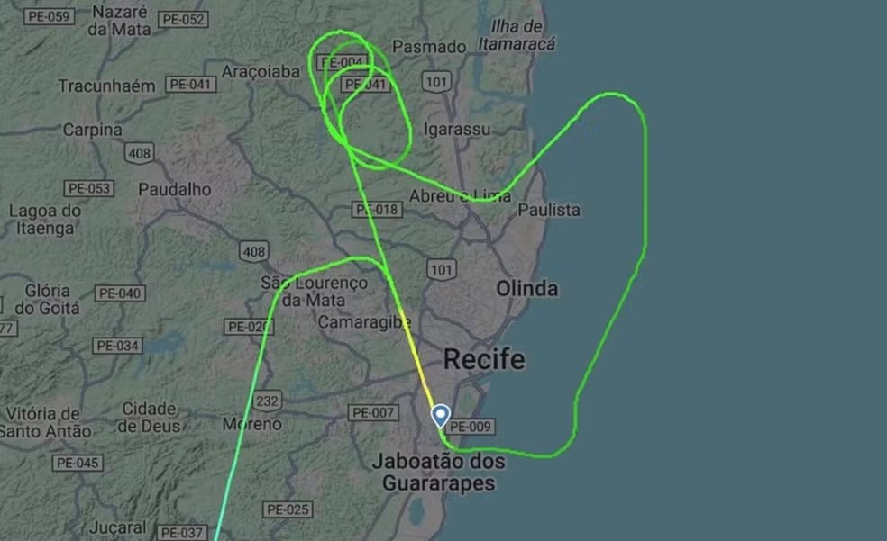 Segundo o registro do voo no site Flightradar, que monitora voos no mundo inteiro, a aeronave sobrevoou a região antes de uma nova tentativa de pouso. O avião passou por cima do Oceano Atlântico, próximo à costa pernambucana, e depois fez um trajeto em círculos sobre uma área rural próxima ao município de Igarassu, no Grande Recife.