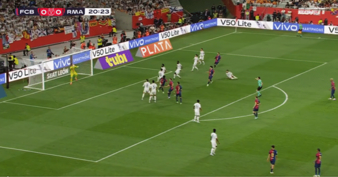 Nos primeiros 15 minutos, os culés geraram duas boas oportunidades em lances pelos lados com Lamine Yamal e Raphinha, mas a zaga merengue conseguiu salvar.