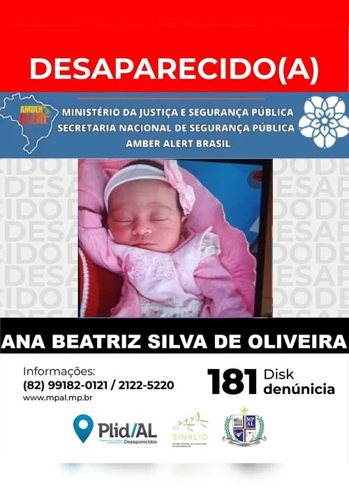 A recém-nascida de 15 dias de vida sequestrada em Novo Lino, no interior do Estado, foi incluída no Programa de Localização e Identificação de Pessoas Desaparecidas (PLID) do Ministério Público de Alagoas (MPAL).