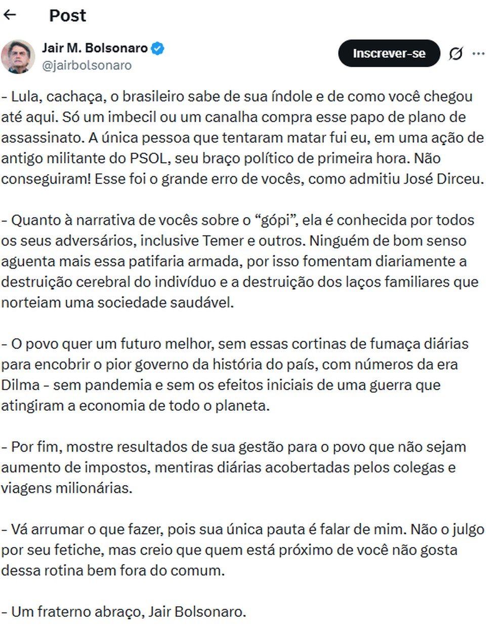 Tweet de Jair Bolsonaro citado no processo — Foto: X / Jair BolsonaroTweet de Jair Bolsonaro citado no processo — Foto: X / Jair Bolsonaro