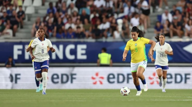 O Brasil de Arthur Elias começou dominando totalmente a partida. As francesas não conseguiam respirar no início do primeiro tempo, com uma Seleção Brasileira que pressionava alto e se lançava ao ataque.