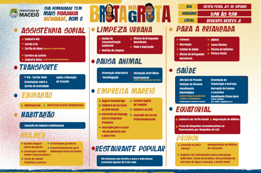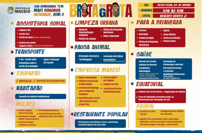 Nesta sexta-feira (24), a Prefeitura de Maceió realiza mais uma edição do programa Brota na Grota, agora na rua Boa Vista, localizada no bairro do Benedito Bentes 2, das 9h às 15h. A ação acontece em frente à Assembleia de Deus e oferece diversos serviços gratuitos, levando cidadania, inclusão social e inovação aos moradores da região.