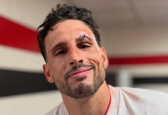 O São Paulo publicou nas redes sociais uma imagem de Calleri com oito pontos no supercílio após choque com o defensor mineiro no jogo em que a equipe paulista goleou seu adversário por 4 a 1.