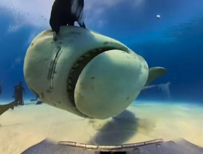 Num dos frames mais icônicos, os mergulhadores podem ser vistos olhando para o predador. Eles aparecem perfeitamente enquadrados pelas sua mandíbula. É um clique e tanto! Quando o animal, por fim, percebe que a câmera não é comestível, ele cospe o instrumento de volta para os mergulhadores.