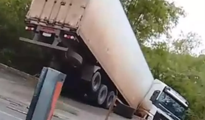 Vídeos e fotos que circulam nas redes sociais mostram o veículo inclinado, com a parte traseira suspensa.