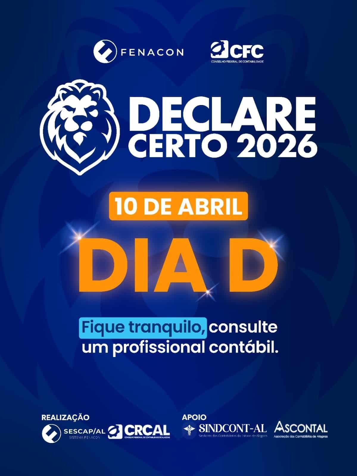A campanha nacional Declare Certo 2026, idealizada pela Federação Nacional das Empresas de Serviços Contábeis (FENACON) em conjunto com o Conselho Federal de Contabilidade (CFC), será realizada em Maceió no próximo dia 10 de abril, das 10h às 20h, no Maceió Shopping.