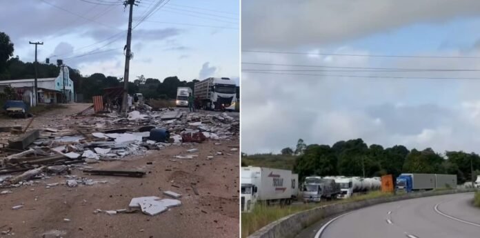 Com o forte impacto, parte da carga se espalhou pela pista, o que interrompeu o tráfego por alguns instantes para a retirada do material e a adoção de medidas de segurança.