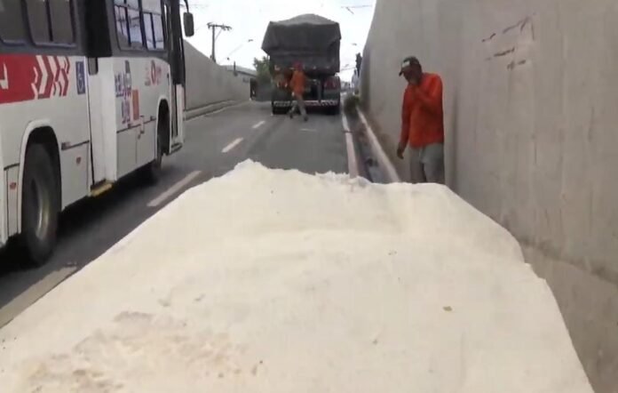 Carreta quebra embaixo de viaduto no Farol e derruba fertilizante na pista