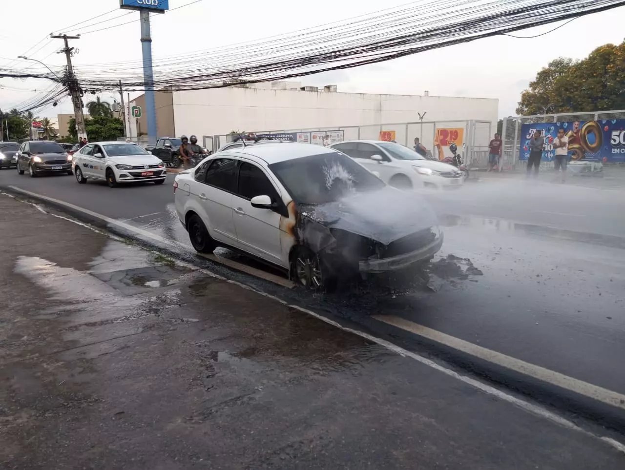Um carro pegou fogo no fim da tarde desta segunda-feira (13) em frente a um shopping localizado na Avenida Gustavo Paiva, no bairro da Jatiúca, em Maceió. As imagens do incêndio chamaram a atenção de quem passava pela região e circularam nas redes sociais.