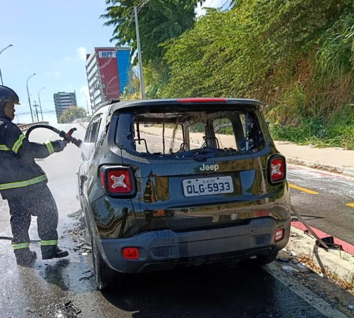 Um veículo Jeep, de cor chumbo, foi tomado pelas chamas na tarde desta quinta-feira, 27, na Avenida Josefa de Melo, no bairro Barro Duro, em Maceió.