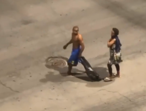 No vídeo abaixo, foi possível observar o instante em que o homem, sem camisa, de bermuda azul e de lenço verde na cabeça, arremessa o objeto, e depois, com o uso da força, faz a vidraça se espatifar.