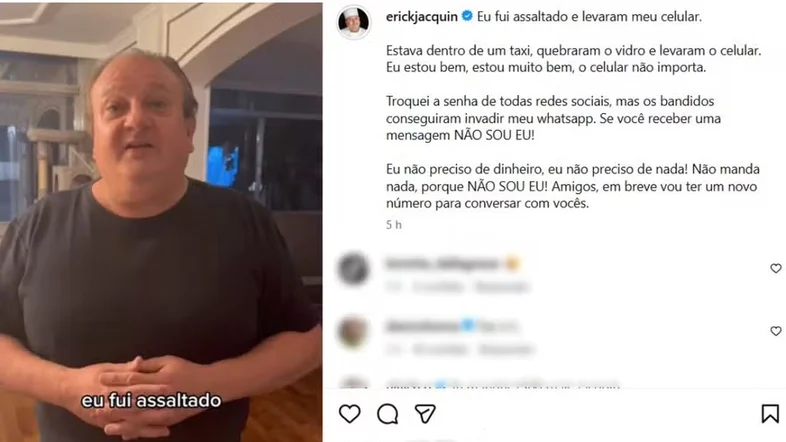 Jacquin, que também é apresentador, esclareceu que seu aparelho celular não continha aplicativos bancários. Contudo, fez um alerta importante sobre o risco de golpes, já que os criminosos podem tentar se passar por ele para enganar seus contatos.