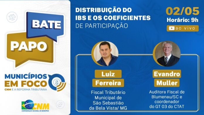 Nesta sexta-feira, 2 de maio, a Confederação Nacional de Municípios (CNM) realiza mais uma edição do bate-papo Municípios em foco: CNM e a Reforma Tributária. O assunto abordado será a distribuição do Imposto sobre Bens e Serviços (IBS) e os coeficientes de participação. O imposto entrará em vigor a partir do próximo ano e, desde já, o Conselho Técnico das Administrações Tributárias (CTAT) orienta, por meio da Nota Técnica 4/2025, as administrações financeiras municipais a adotarem medidas para impulsionar a arrecadação e facilitar a gestão do tributo.