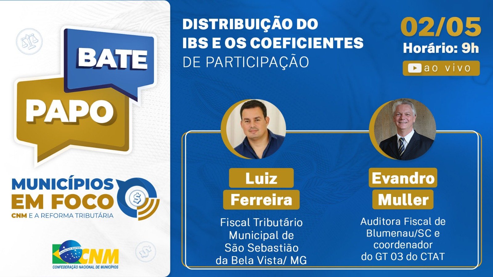 Os convidados da CNM para abordar a temática são o auditor fiscal de Blumenau (SC) Evandro Muller e o fiscal tributário municipal de São Sebastião da Bela Vista (SP), Luiz Pablo Souza Ferreira.