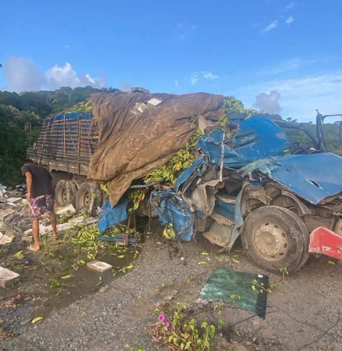A Polícia Rodoviária Federal está no local e confirmou a dinâmica da colisão. Segundo o órgão, o caminhão que transportava banana colidiu na traseira do caminhão que transportava reciclável. Devido à colisão, o que transportava recicláveis tombou na rodovia.