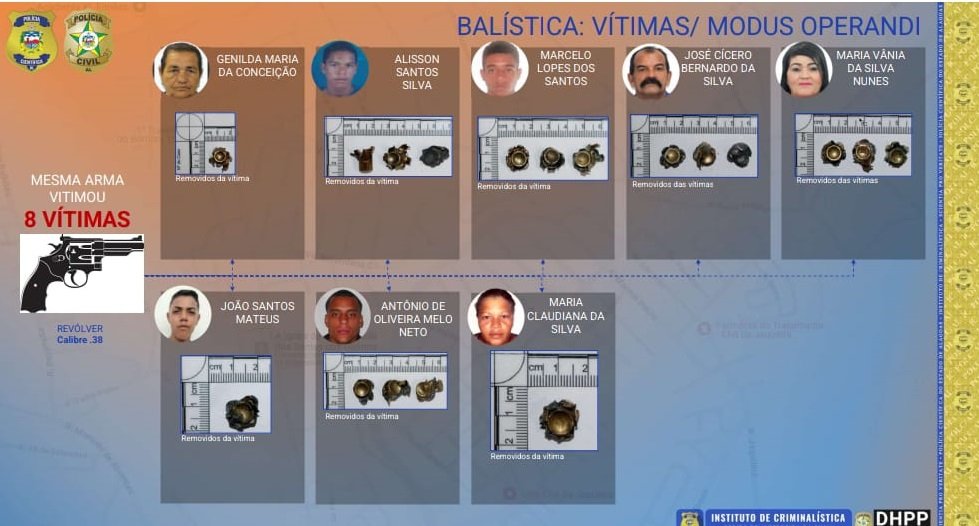 O delegado explicou que, nos últimos três meses, as investigações dos casos mais antigos foram aprofundadas e os inquéritos precisaram ser reabertos. “Nós elucidamos 8 homicídios consumados, todos qualificados, além de três tentativas de homicídios. Conseguimos também provas técnicas, foi solicitado ao Instituto de Criminalística a realização de exames de micro comparação balística. Dos projéteis encontrados nos corpos das oito vítimas, a Polícia Cientifica constatou que em sete delas, os projéteis foram proferidos pelo cano da mesma arma de fogo, um revólver calibre 38”, disse Gilson Rêgo.