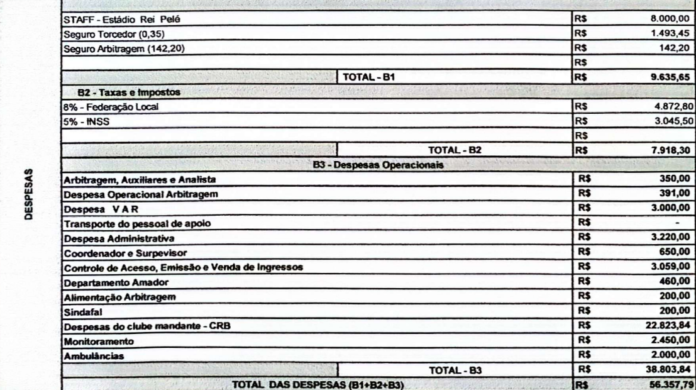 Os gastos incluem a despesa operacional do estádio, o árbitro de vídeo, emissão e venda de ingressos, o monitoramento, ambulâncias, INSS, a taxa da FAF e outros custos. Confira, abaixo, todas as despesas.