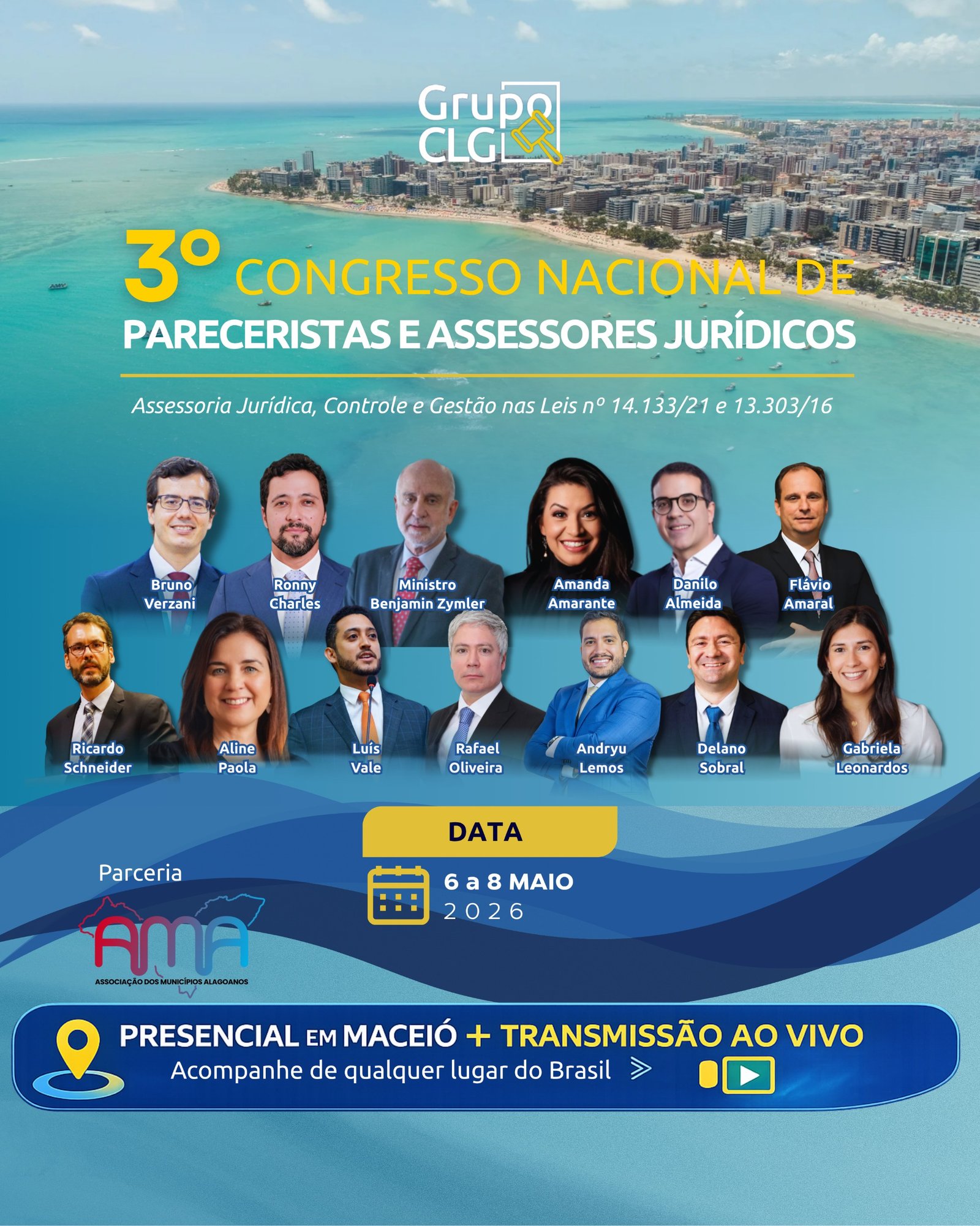Maceió sediará, entre os dias 6 e 8 de maio de 2026, o 3º Congresso Nacional de Pareceristas e Assessores Jurídicos, um dos principais encontros do país voltados à atuação jurídica na administração pública. O evento será realizado no Centro de Convenções da capital alagoana, com participação presencial e on-line.