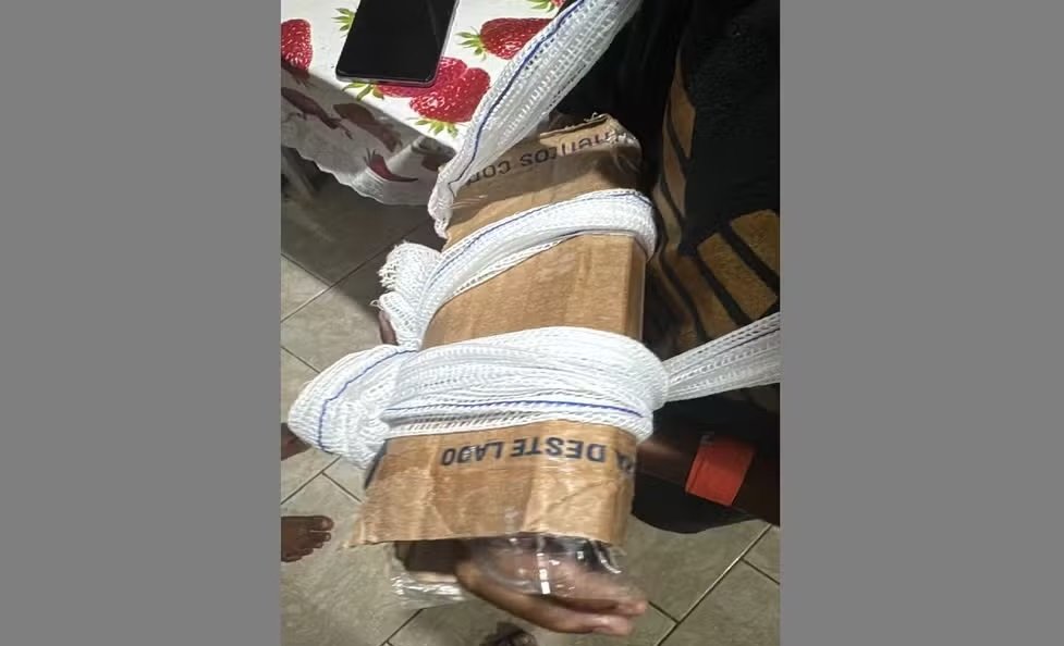 Os profissionais de saúde improvisaram uma tala com papelão para imobilizar o braço, como forma de garantir algum suporte até que fosse possível o atendimento especializado.
