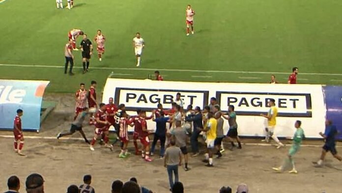 Na sequência, após a reposição de um arremesso lateral a favor do Náutico, os jogadores do Timbu e os gandulas se estranharam e cenas lamentáveis protagonizaram o confronto. A Polícia Militar precisou intervir depois de alguns minutos e o árbitro Alisson Sidnei Furtado, do Tocantins, encerrou o jogo logo depois.