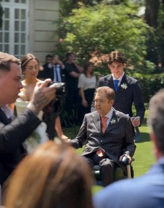 Em imagens publicadas pelo filho, João Silva, Faustão aparece de cadeira de rodas, de mãos dadas com a noiva. O filho mais novo, Rodrigo Silva, ajudou a levar a cadeira.