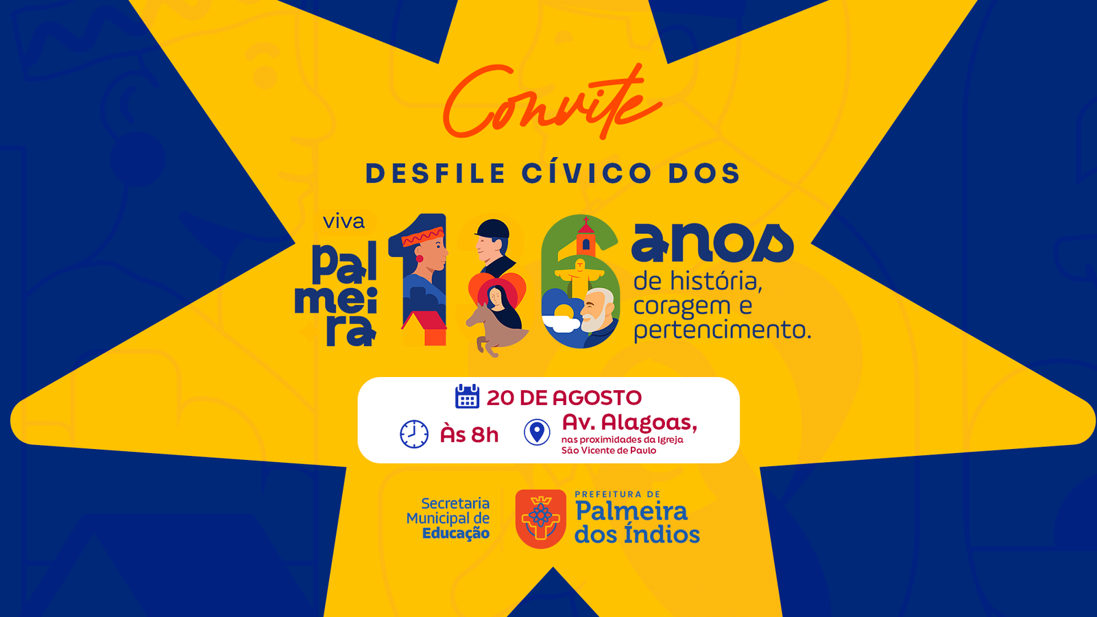 A Prefeitura de Palmeira dos Índios, por meio da Secretaria Municipal de Educação, realizará nesta quarta-feira (20) o tradicional Desfile Cívico em comemoração à Emancipação Política do município, que este ano tem como tema “136 anos de história, coragem e pertencimento”. A concentração será às 7h30, na Avenida Alagoas. O hasteamento das bandeiras acontece às 8h, seguido pelo início do Desfile, às 8h30.
