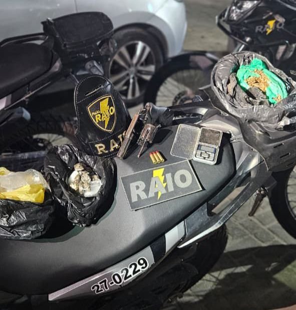 Na capital, a Companhia de Raio realizava motopatrulhamento tático no bairro do Jardim Petrópolis, quando recebeu uma denúncia de que um indivíduo estaria armado e traficando drogas na região. O suspeito, de 29 anos, ao perceber a presença policial, tentou fugir, descartando uma sacola e um objeto da cintura. Durante a perseguição, ele sofreu uma queda em área de mata, sendo imobilizado após resistir à abordagem.
