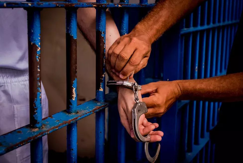 Preso sendo algemado atrás de grades