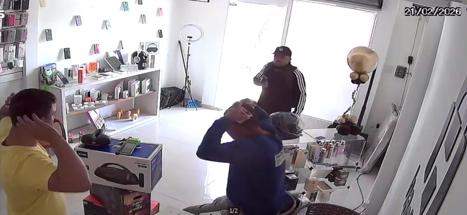 As imagens mostram o momento em que o primeiro suspeito, vestindo jaqueta preta, entra no estabalecimento e com uma arma de fogo rende duas pessoas que estão no local. Posteriormente, outros dois suspeitos invadem o local usando balaclavas – o que pode indicar que são conhecidos na região ou da própria vítima – e em alguns segundos recolhem toda permacedoria, que é colocada em um saco branco.