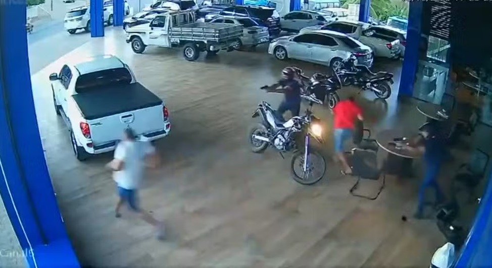 O crime foi registrado por câmeras de segurança instaladas no local. Um dos vídeos mostra dois homens chegando a uma concessionária de veículos em uma motocicleta.