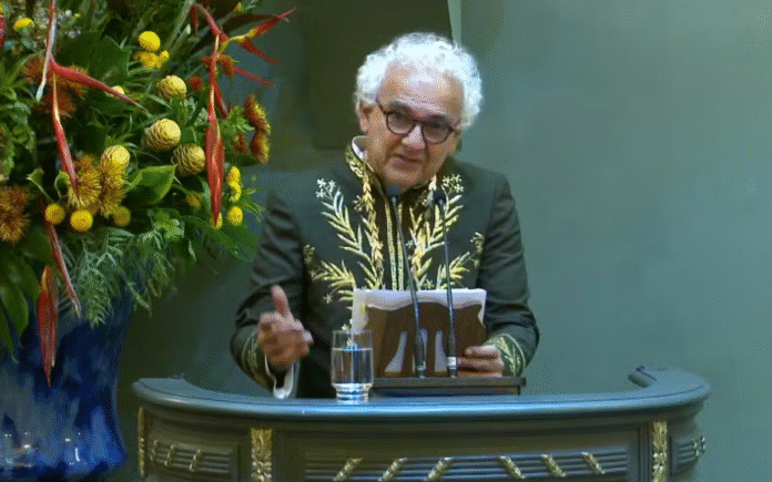 Milton Hatoum durante discurso na cerimônia de posse na Academia Brasileira de Letras (ABL) | Reprodução/Youtube/Academia Brasileira de Letras