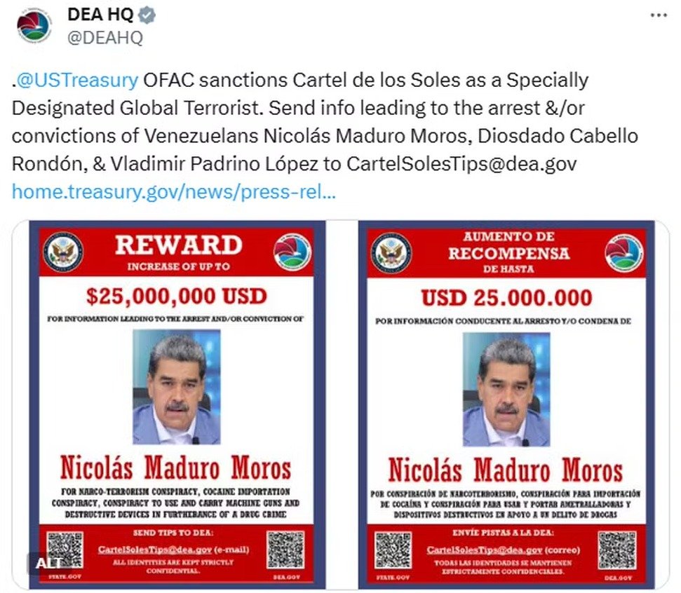 “O Cartel de los Soles é um grupo criminoso sediado na Venezuela, liderado por Nicolás Maduro Moros e outros membros de alto escalão do regime de Maduro. O grupo fornece apoio material a organizações terroristas estrangeiras que ameaçam a paz e a segurança dos Estados Unidos, em especial o Tren de Aragua e o Cartel de Sinaloa”, afirma o documento do Departamento do Tesouro dos EUA.