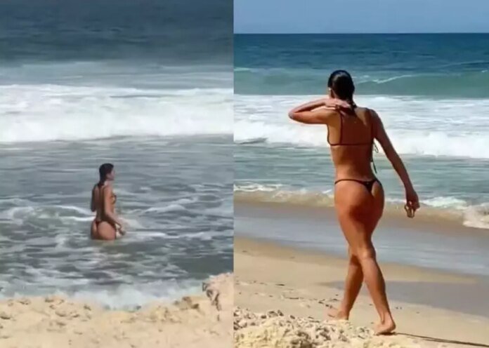 Sozinha, a artista entrou no mar ainda segurando um acessório de cabelo. Bem à vontade, a atriz deu alguns mergulhos e, sem perceber que estava sendo filmada pelo fã que estava sentado na areia, saiu andando calmamente em direção a seus pertences, sem ser incomodada.