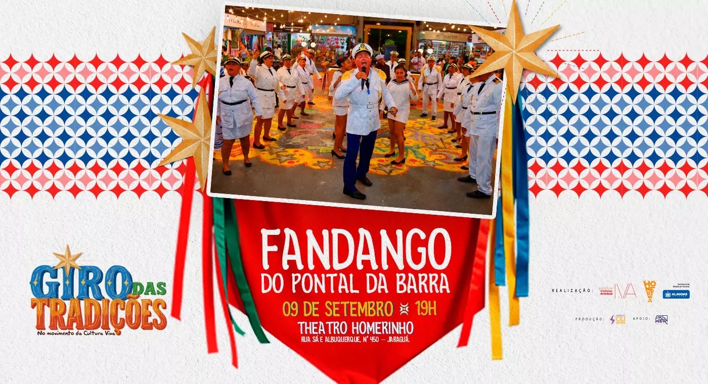 A segunda edição do “Giro das Tradições – No Caminho da Cultura Viva”, será realizada na próxima terça-feira, 9 de setembro, a partir das 19h, no Theatro Homerinho, no bairro de Jaraguá. A iniciativa, com entrada gratuita, é do Instituto de Vivências Artísticas (IVA), em parceria com a Secretaria de Turismo de Alagoas (Setur/AL), e receberá o grupo tradicional Fandango do Pontal da Barra. Os ingressos serão distribuídos 30 minutos antes do início.