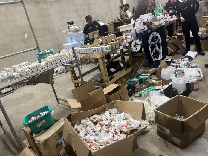 Imagens fornecidas pela PC mostram uma grande quantidade de medicamentos em uma central improvisada de distribuição, incluindo canetas emagrecedoras, que possuem alto valor comercial no mercado.