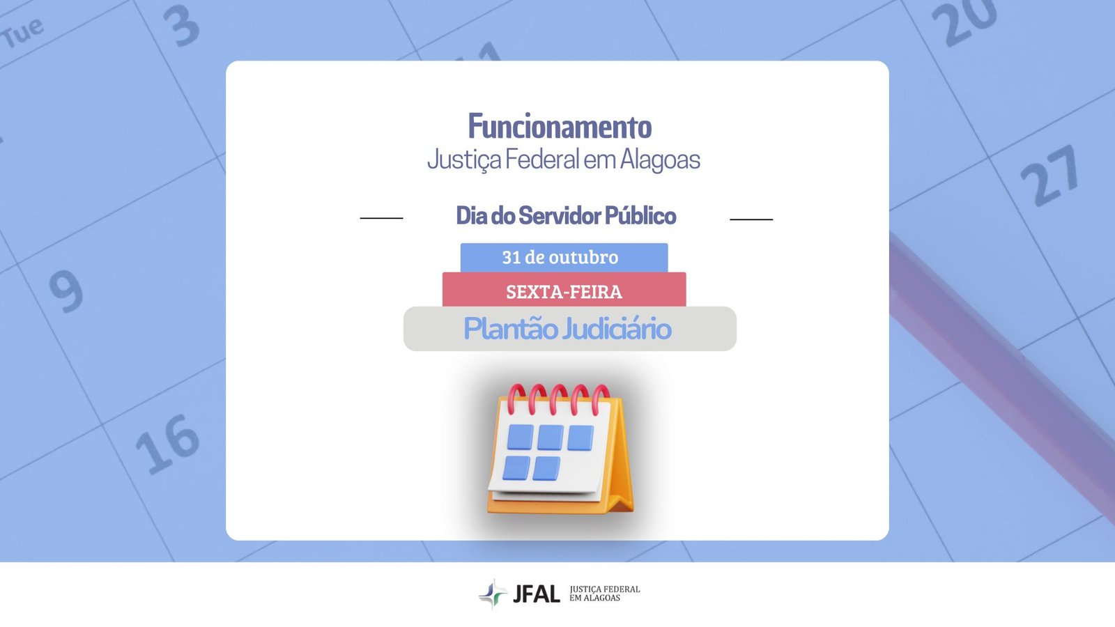 O feriado reservado ao Dia do Servidor Público será alterado no âmbito da Justiça Federal em Alagoas (JFAL). Em vez do tradicional 28 de outubro, a pausa no expediente acontecerá na sexta-feira, 31 de outubro, quando todos os prazos processuais ficam suspensos e passam a contar somente no próximo dia útil, ou seja, 3 de novembro.