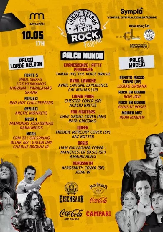 O Lorde Nelson Rock Festival é patrocinado por Eisenbahn, Coca-Cola, Jack and Coke e Campari e é uma realização da Montana Records, Demétrio Produções e Lorde Nelson Rest Pub. Os ingressos podem ser adquiridos pelo Sympla ou pelo link da Bio do Instagram @lordenelson .