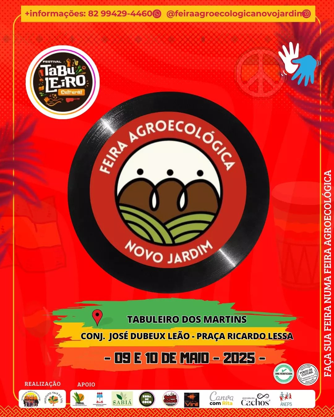 Serão dois dias de muita cultura, música, comida boa e conexão com a natureza e com a cidade, uma programação leve, diversa e saudável para toda a família. A Feira Novo Jardim é mais que um lugar de compras – é um espaço de encontro, de troca, de resistência e celebração. É a roça invadindo a cidade com afeto, arte e alimento de verdade. E no Tabuleiro Cultural, a feira vai mostrar que a agricultura familiar e a cultura popular andam de mãos dadas, celebrando esse momento de fortalecer quem planta e quem faz cultura com o coração.